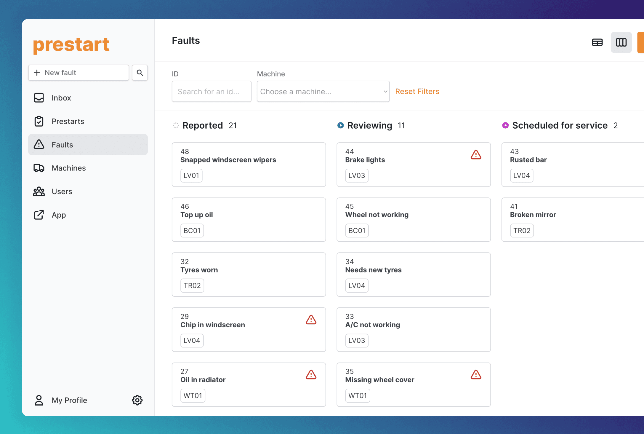 Inspire confidence and maximise operational profitability with our simple prestart and fault management app.